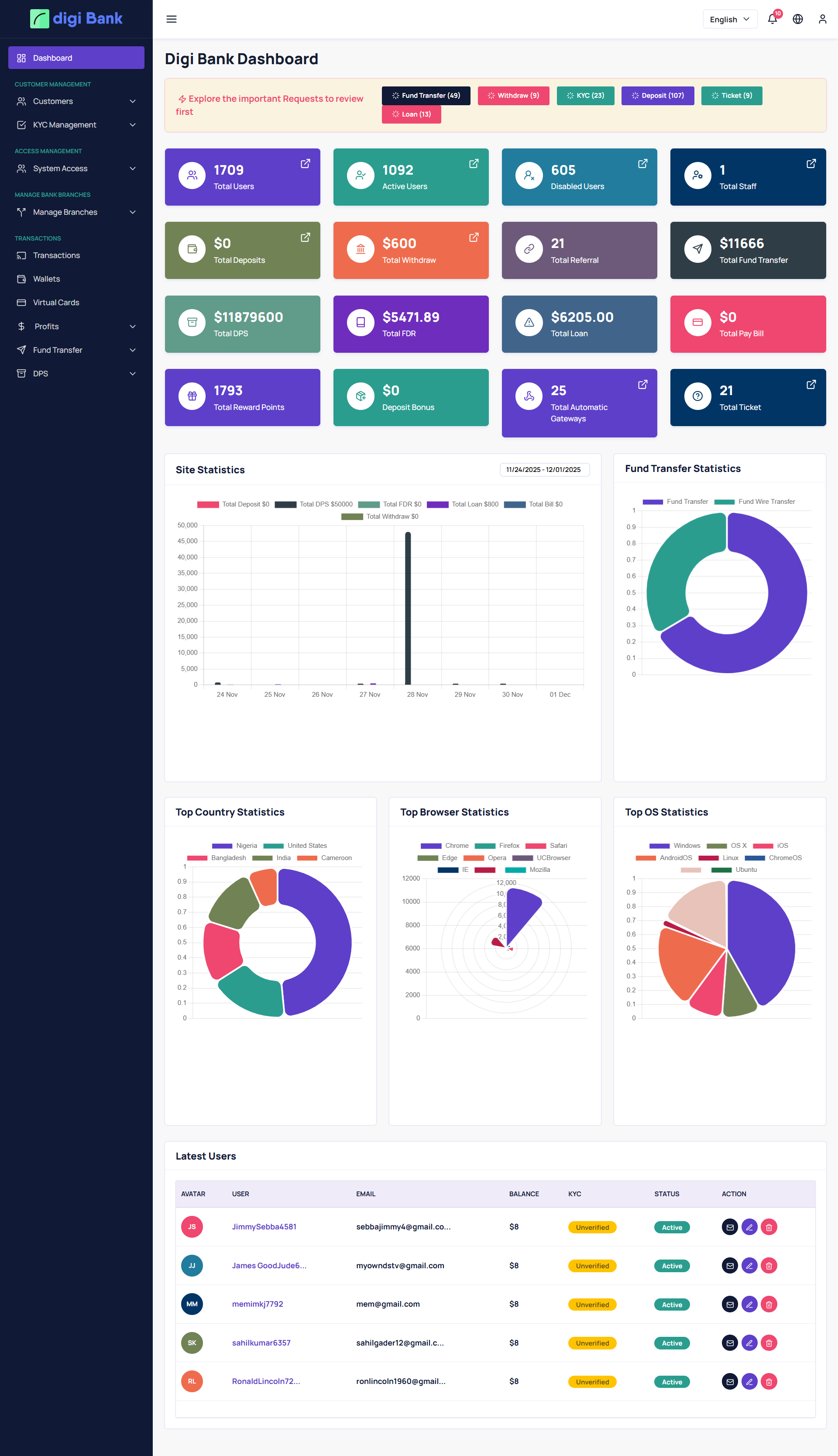 Customer Management and Account OperationsCustomer management includes rich customer profiles with full account history, registration details, and verification status. Administrators can quickly find users with advanced filters, review transactions, manage account status, adjust balances with appropriate approvals, communicate with customers, and handle refunds or reversals, with every change logged for transparency.