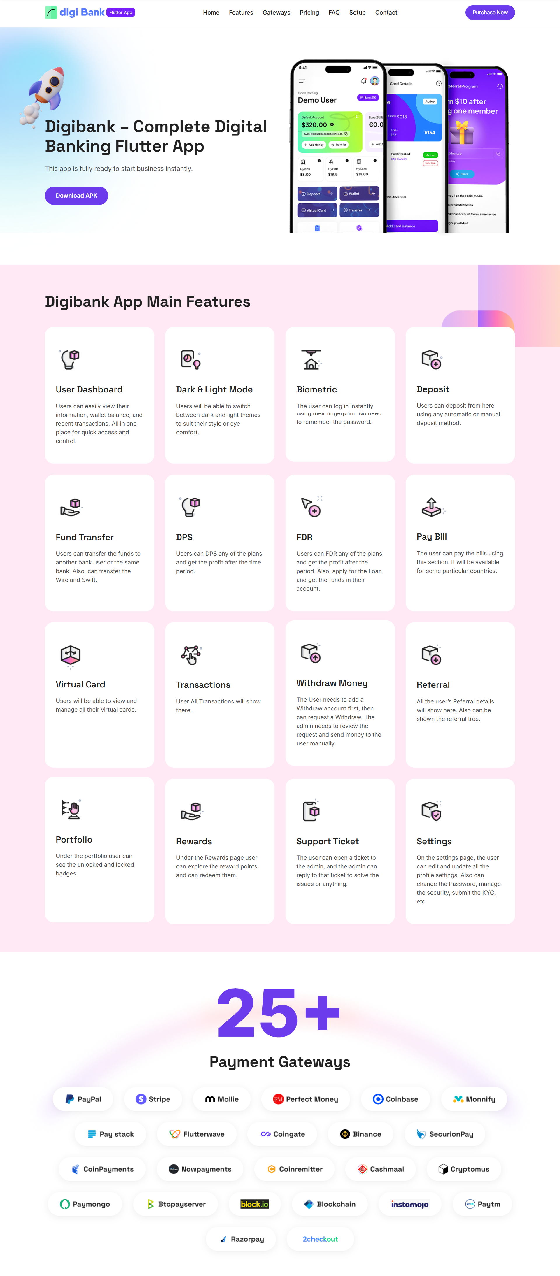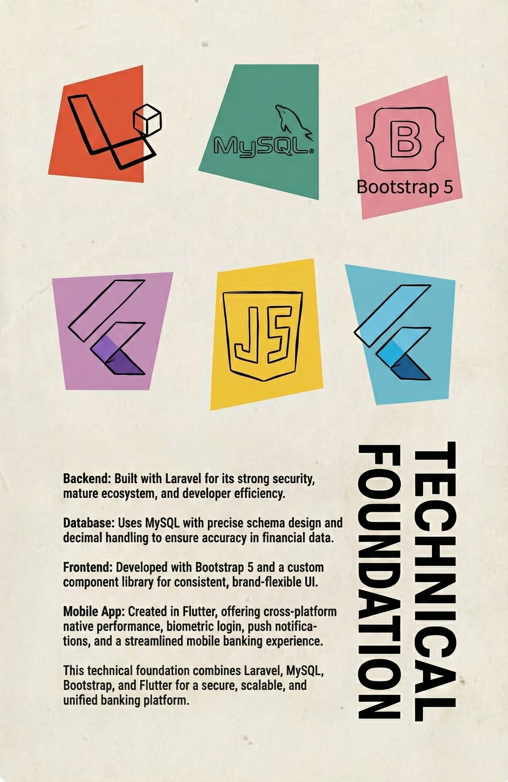 The Flutter app mirrors the full capabilities of the web platform while optimizing for mobile use. It offers biometric login for quick, secure access and push notifications to keep users updated on transactions and account activities. The interface is touch-friendly, with streamlined navigation and optimized forms for easy use. Offline access lets users view balances and transactions even without connectivity, and both light and dark modes are supported to suit user preferences.