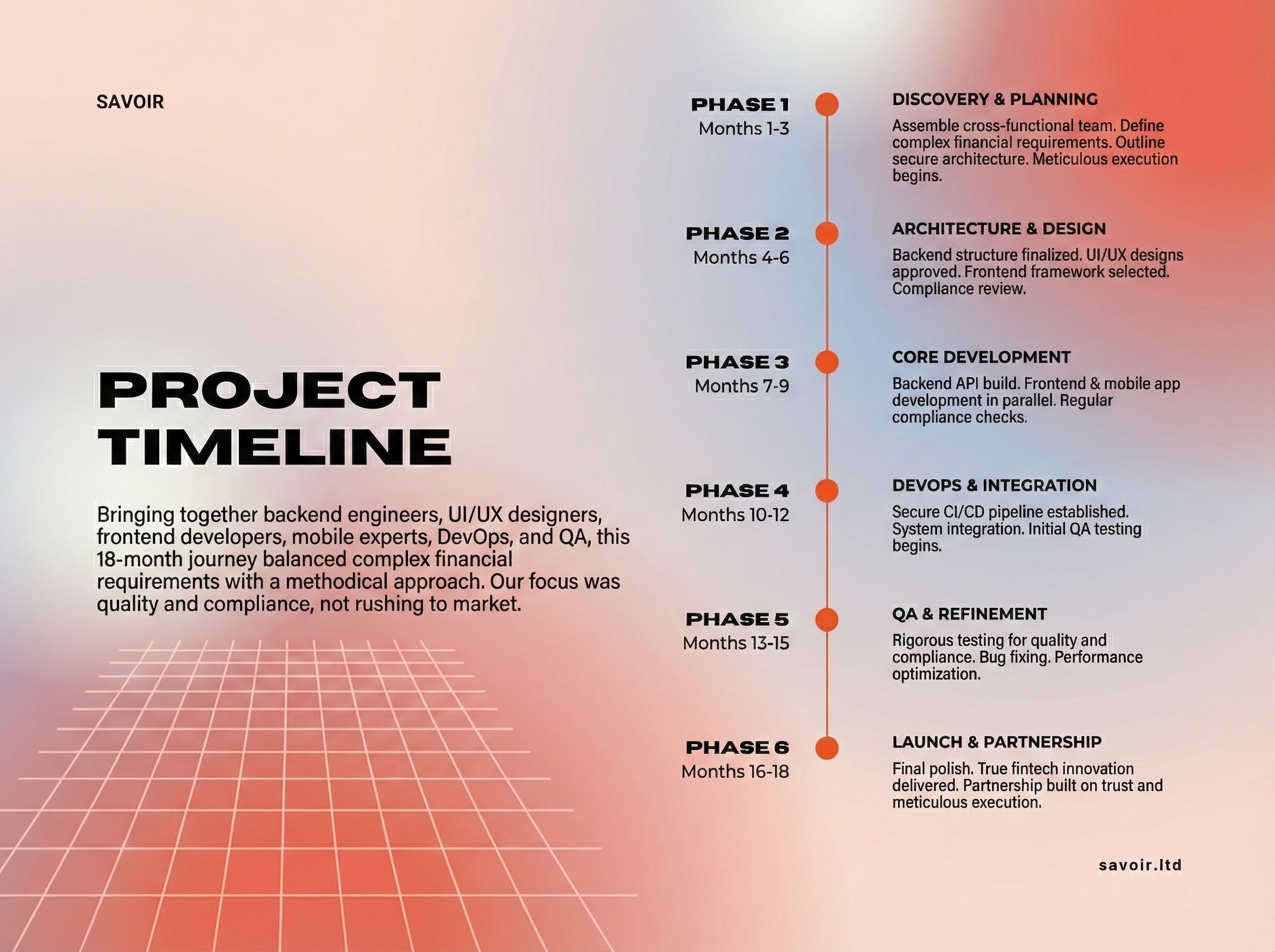 Bringing together backend engineers, UI/UX designers, frontend developers, mobile experts, DevOps, and QA, this 18-month journey balanced complex financial requirements with a methodical approach. Our focus was quality and compliance, not rushing to market. True fintech innovation demands understanding the stakes—a value our client embraced wholeheartedly, enabling a partnership built on trust and meticulous execution.