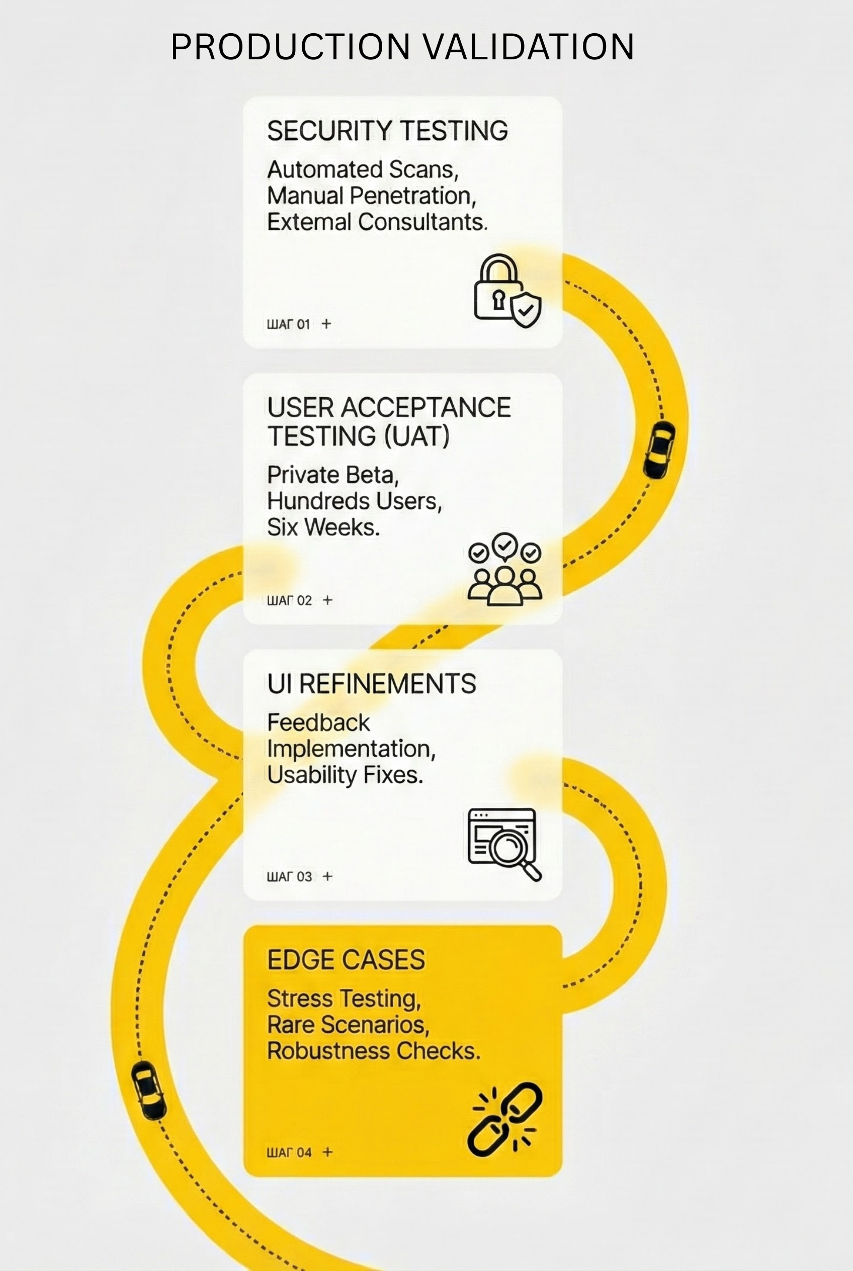 Security was a top focus, combining automated scans, manual penetration tests, and independent expert reviews to confirm a robust defense. User acceptance testing with hundreds of beta users provided vital feedback that shaped UI refinements and uncovered edge cases beyond internal testing.