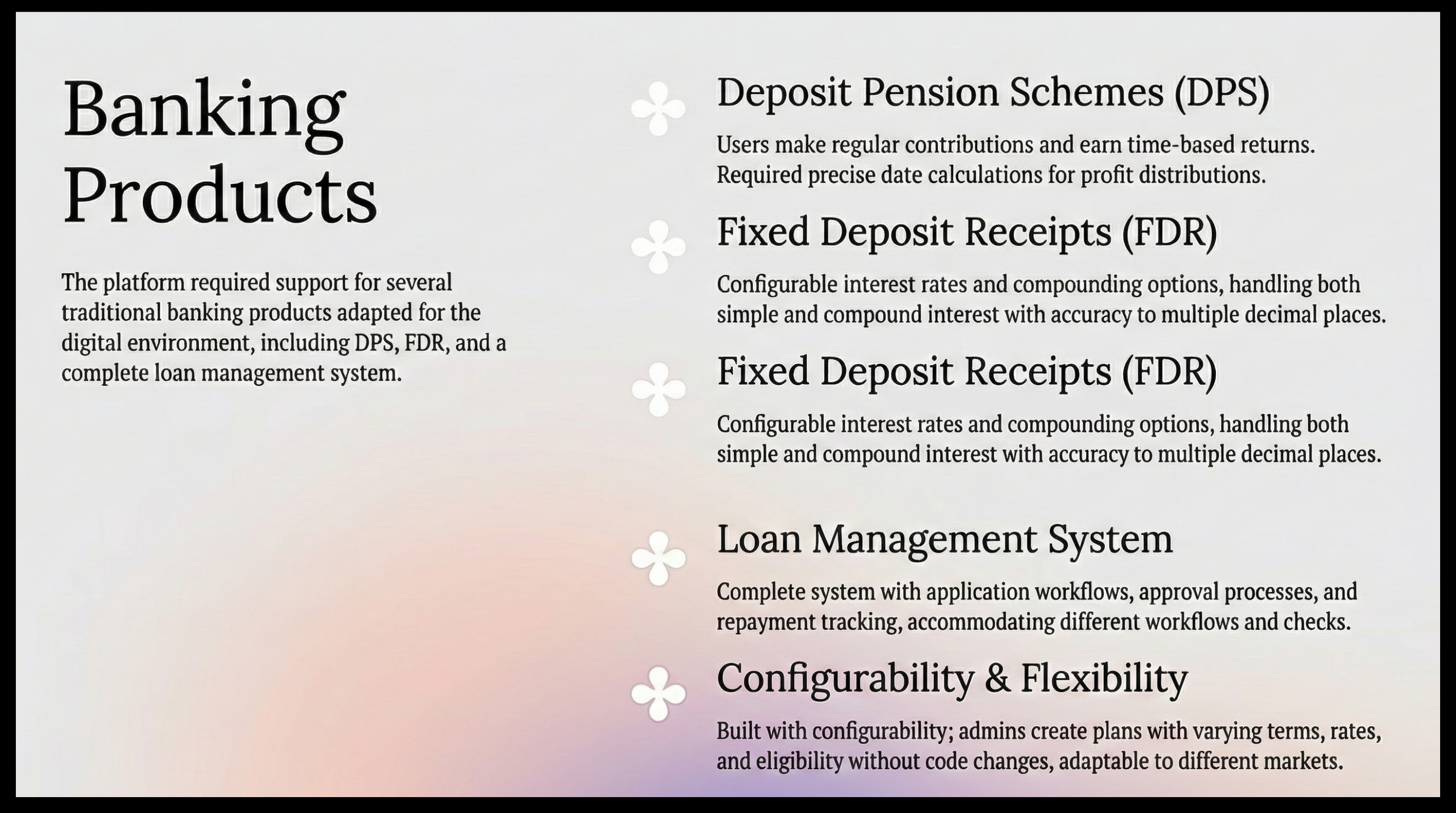 Banking Product ConfigurationAdministrators can configure DPS, FDR, and loan products with tailored parameters, eligibility rules, and built-in calculators for projected returns. Product versioning keeps existing customer terms intact while allowing new offers to roll out cleanly, with eligibility checks enforced automatically across the platform.