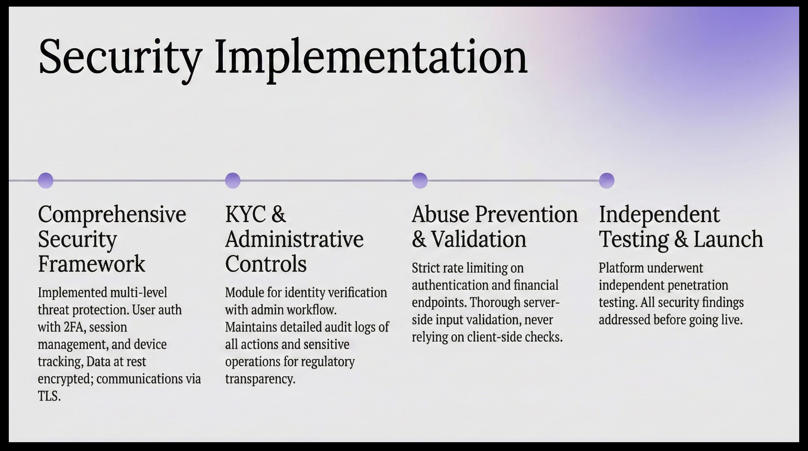 Our QA process covered every angle, from automated unit tests validating core logic to end-to-end tests simulating real user journeys. Performance and stress testing ensured seamless operation under heavy loads, crucial for transaction integrity.