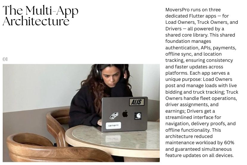 For MoversPro, every module — from load tracking panels to bidding interfaces — was engineered to integrate seamlessly across apps and dashboards. This flexible architecture allows new features, workflows, or data layers to be added effortlessly, making the platform as future-ready as it is powerful today.