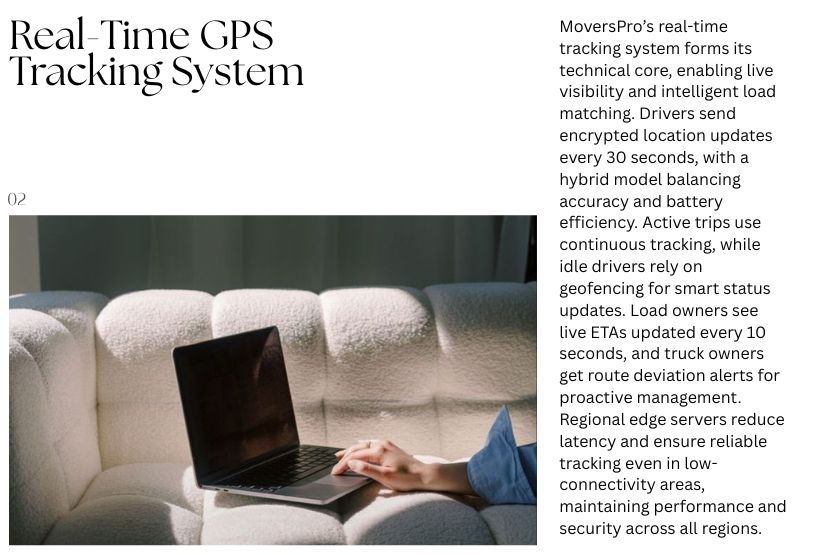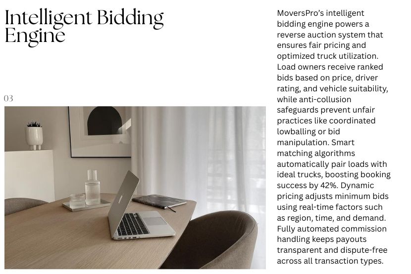 The platform currently handles over 15,000 daily bookings spanning multiple regions, delivering exceptional performance with sub-second response times and 99.9% uptime reliability. A robust data processing engine continually analyzes supply-demand patterns, enabling predictive logistics planning and dynamic pricing strategies that adapt to market conditions in real time. Integrated payment gateways ensure frictionless settlements between stakeholders, while advanced reporting and analytics dashboards empower businesses with actionable insights into operational efficiency, cargo utilization, and driver performance. MoversPro stands as a comprehensive logistics infrastructure solution, transforming traditional transportation models into agile, data-driven operations built for the future of logistics.
