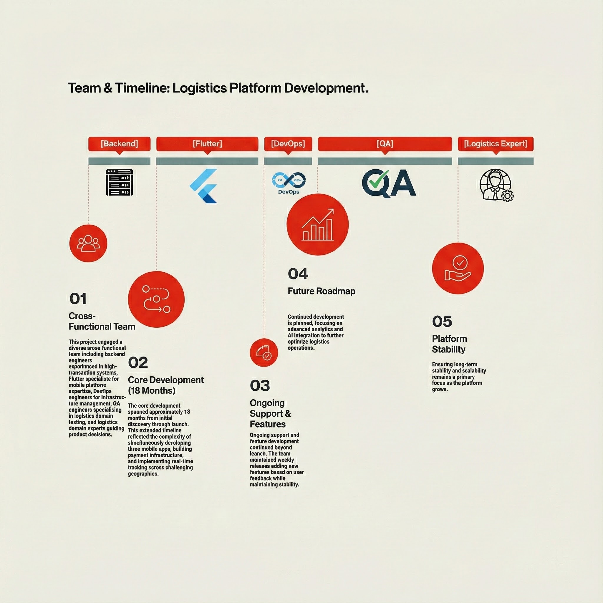 The MoversPro project brought together a cross-functional team of backend developers, Flutter engineers, DevOps specialists, QA testers, and logistics domain experts. Core development ran for 16 months from discovery to launch, covering three mobile apps, payment systems, and real-time tracking. Weekly release cycles ensured continuous improvement and rapid feature updates while maintaining platform stability.