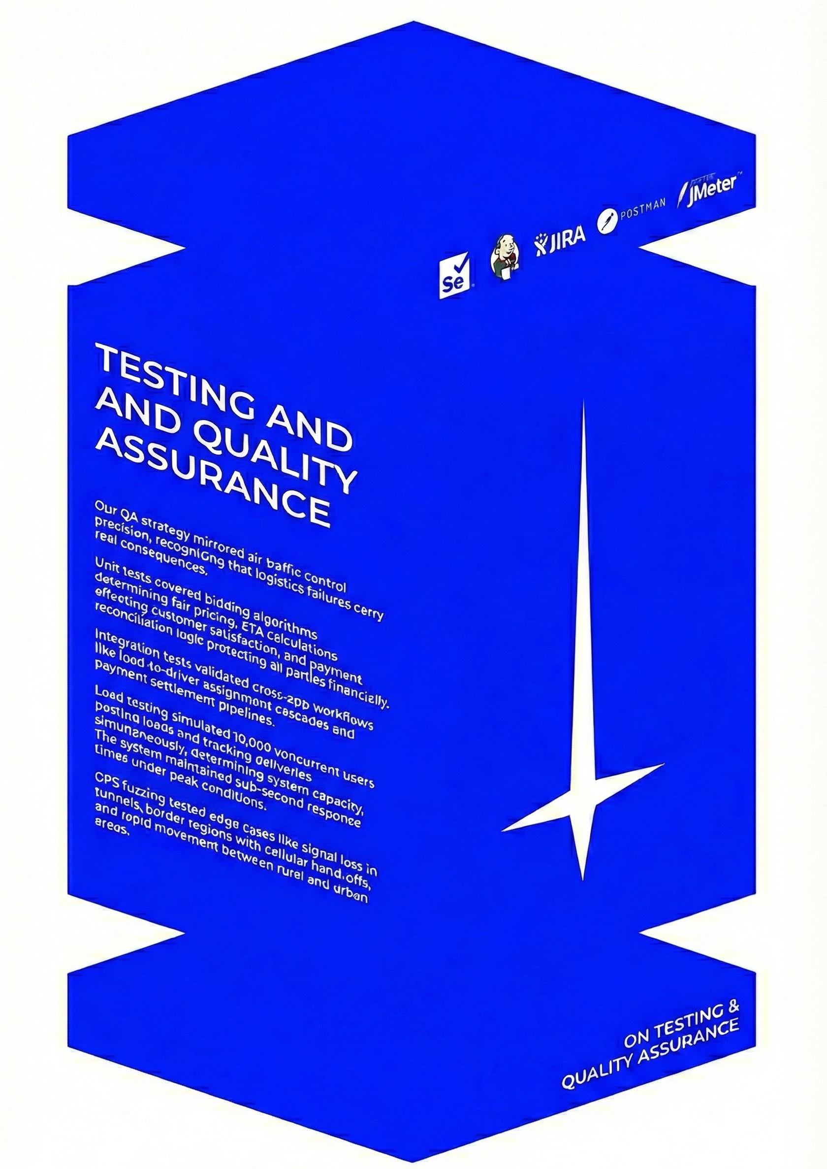 MoversPro’s testing and QA framework was designed with the precision of air traffic control, acknowledging that downtime or errors could disrupt real-world logistics operations. Rigorous unit testing covered critical systems like bidding algorithms, ETA calculations, and payment reconciliation to ensure accuracy and fairness. Integration tests validated seamless workflows between apps , from load posting to driver assignment and final payment settlements. Load testing pushed the system with up to 10,000 concurrent users, maintaining sub-second response times even under high-stress conditions. Specialized GPS fuzzing simulations further tested edge cases such as tunnel drop-offs, border-region hand-offs, and rapid urban-rural transitions.
